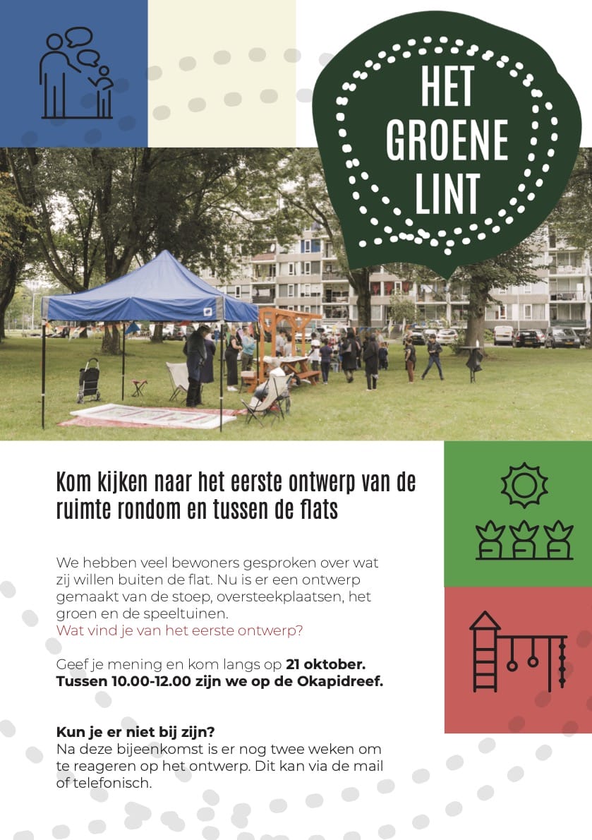 In september vond de eerste bewonersbijeenkomst plaats. We zijn in gesprek gegaan over de inrichting van de binnenhoven. Met deze input is een eerste concept ontwerp gemaakt voor de binnenhoven. Deze is in oktober gepresenteerd in een portiek, waar bewoners langs konden komen. Ook is het ontwerp huis aan huis verspreid. Bewoners kunnen laten weten wat ze van het ontwerp vinden door te mailen, bellen of een (voice)bericht te sturen via WhatsApp.