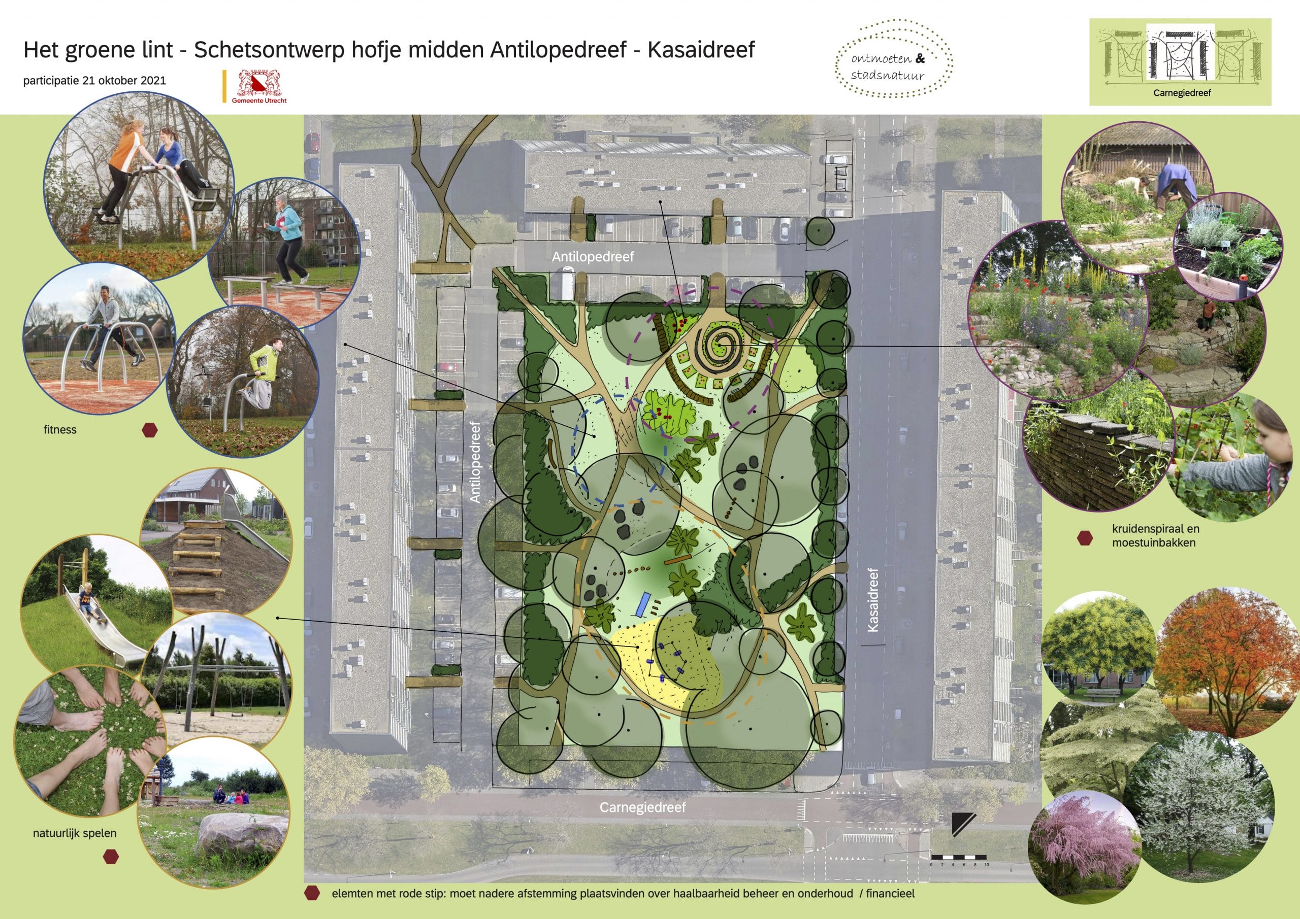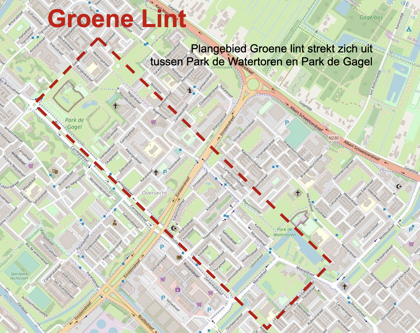 In de eerste helft van 2022 starten we met de hoven aan de Carnegiedreef, onderzoeken we hoe we met verschillende partijen, zoals de bibliotheek, kleine verbeteringen kunnen uitvoeren langs de route. In de tweede helft van 2022 starten we bij de hoven aan de Zamenhofdreef. We sluiten ook aan bij andere projecten, zoals de verbetering van het plein bij winkelcentrum Gagelhof en groencompensatie (herplanten van groen wat gekapt moest worden) van de Ivoordreef. Zo willen we het Groene Lint inzetten als methodiek voor gezonde verstedelijking. Een test om te kijken wat er fysiek en sociaal gebeurt. Met veel meer verschillende soorten beplanting, met meer biodiversiteit en ecologische kwaliteit, en met een nieuwe manier om het te beheren. En als de test aanslaat kan het ook op andere plaatsen in Overvecht ingezet worden.